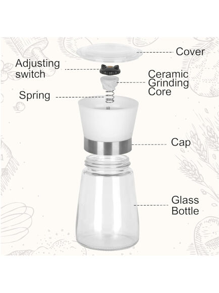 Molinillo especiero vacío, práctico y elegante, diseñado para disfrutar de las especias recién molidas en cada uso. Cuenta con mecanismo profesional de cerámica, recipiente de cristal grueso transparente y un diseño en blanco y negro que encaja en cualquier cocina. Ideal tanto para uso doméstico como para quienes disfrutan cocinando con precisión.